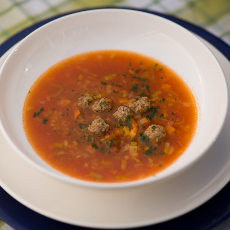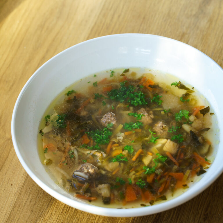 Soep van versgetrokken boullion met veel groenten en gehaktballetjes.