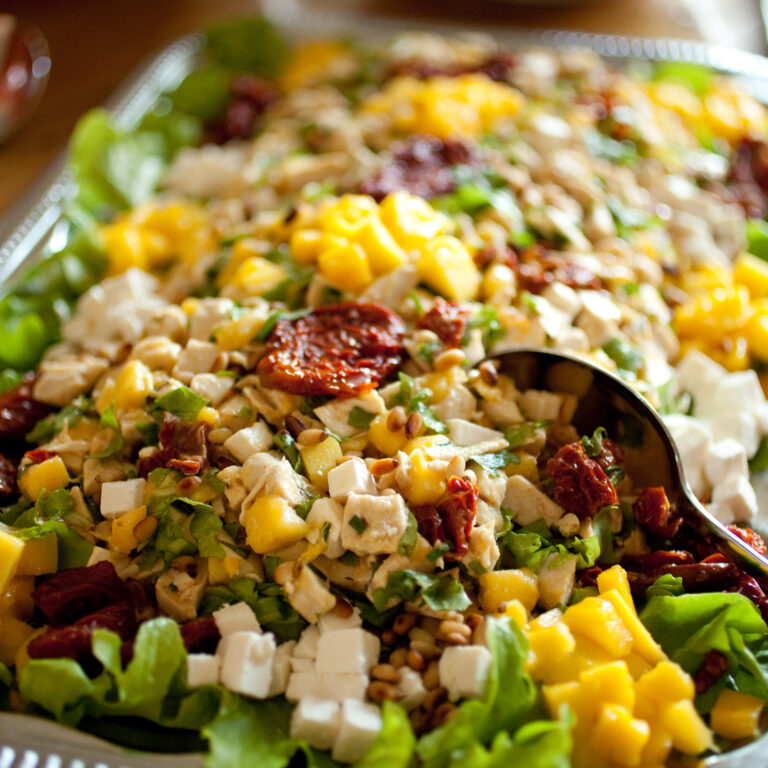 Salade van kip, feta, gedroogde tomaten en stukjes mango.