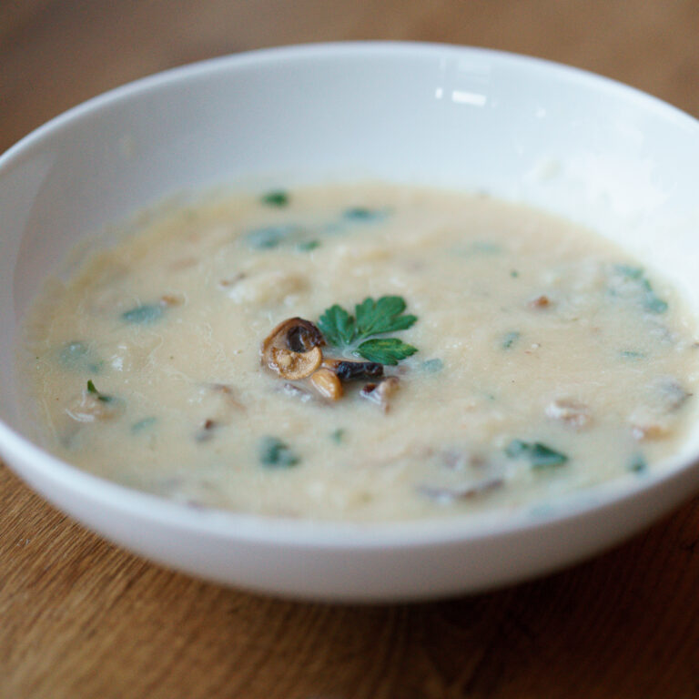 Licht gebonden soep met gerookte kipfilet en oesterzwammen.