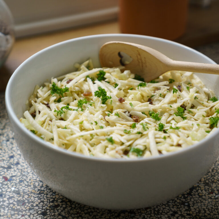 Klassieke salade van selderij, appel, rozijn en walnoot.