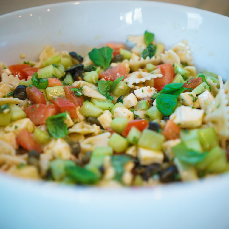 Vegetarische pastasalade met paprika, tomaten, mozzarella, pijnboompitten en basilicum.